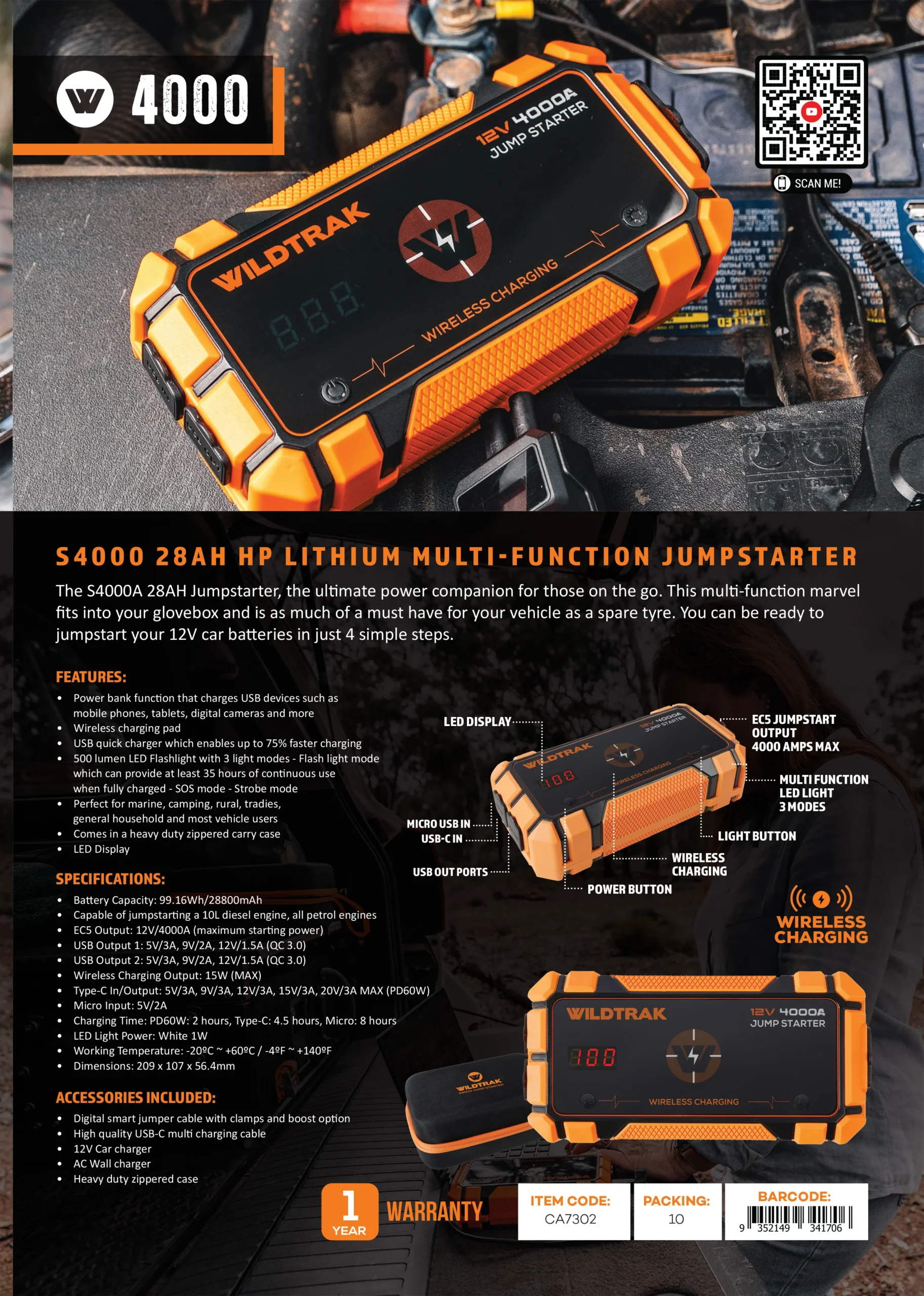 Don’t settle for ordinary jump starters when you can have the S4000 Lithium Multi Function Jump Starter – the MOST POWERFUL car & 4WD (petrol & diesel) jump starter on the market! Get ready to unleash the ultimate power wherever you go. This compact and lightweight jump starter is the perfect companion for tradies, fishos, campers, farmers, offroaders, and adventurers of all kinds. With a staggering 28800mAh battery capacity, this jumpstarter is a force to be reckoned with. It’s not just a jumpstarter – it’s a versatile powerhouse. Charge your phone wirelessly with the convenient 15W charging pad. The EC5 Output of 12V/4000A ensures a reliable jumpstart for your vehicle. This beast can even jumpstart a diesel engine up to 10 litres and all petrol models. But that’s not all! We’ve added a 500 lumen LED flashlight with 3 light modes, ensuring you have a reliable source of illumination in any situation ranging from solid light to flashing strobe light. With USB, USB-C, and micro USB outlets, you can conveniently charge multiple devices at once. The LED display keeps you informed about the battery status, and the digital smart jumper cable with clamps ensures a safe and easy jumpstart every time. And to top it all off, this incredible jumpstarter comes in a heavy-duty protective carry case, keeping it safe and secure during your adventures. Don’t settle for ordinary jumpstarters when you can have the S4000 – the epitome of power, versatility, and reliability. Get yours today and experience the thrill of ultimate power at your fingertips! *To maintain healthy battery life it is recommended to give your 4000A Jumpstarter a maintenance charge every 3 months.
